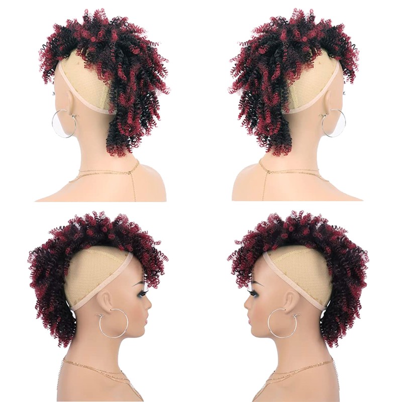 Cola de caballo LeeWin Afro Puff Mohawk con flequillo Bollo corto de pelo rizado afro pervertido Bollo sintético Fauxhawks Jerry Curly Extensiones de pelo de cola de caballo sin cordón con clips de 6BB