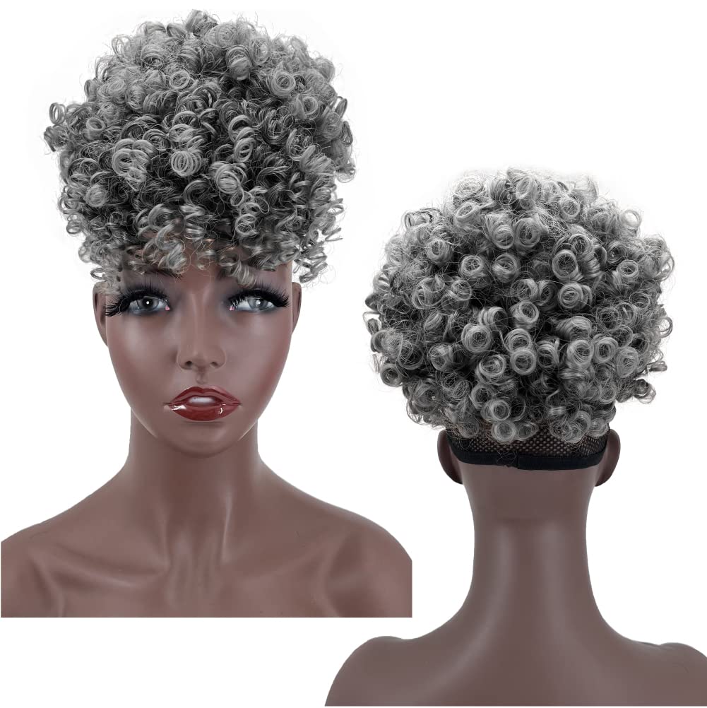 Pelucas de cola de caballo Afro Puff para mujer negra Cola de caballo con cordón Afro Puff rizado y rizado con flequillo de pelo rizado Cola de caballo Afro gris para cabello natural Pelucas de sal y pimienta para mujer